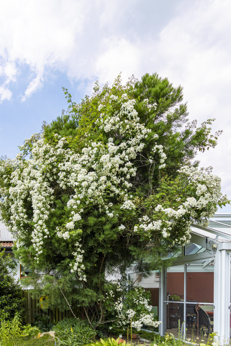 Ein weiterer Blickfang ist eine Kiefer (Pinus), die fast komplett von einer in voller Blüte stehenden Rose (Rosa) bedeckt ist.