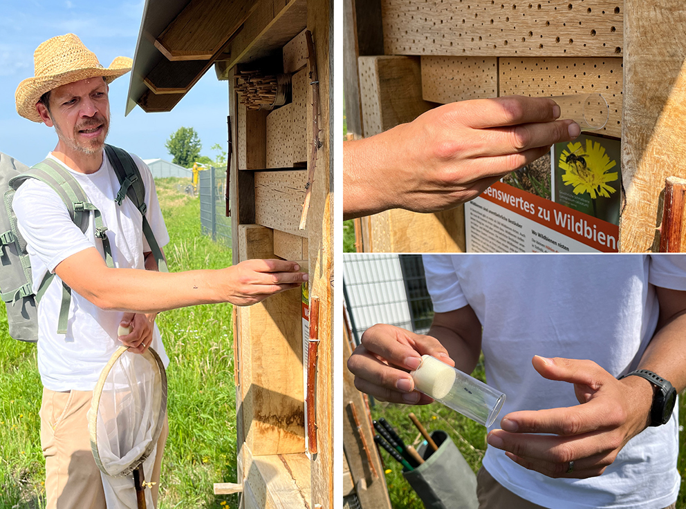 Die Wildbienen-Nisthilfe mit ihren künstlich angelegten Bohrgängen in verschiedenen Materialien (Hartholz, Lehm-Löss, Bambus) ist eines dieser neu geschaffenen Elemente. „Sie nützt nicht nur Wildbienen, sondern auch anderen Insekten, die in Hohlräumen nisten“, erklärt Christian Venne. Er stülpt ein Plexiglas über ein Loch in einem Hartholzklotz, in das kurz zuvor ein kleines schwarzes Insekt geschlüpft ist und wartet, bis es rückwärts wieder herauskommt. Das unscheinbare im Glas wuselnde Insekt entpuppt sich als Grabwespe der Gattung Psenulus. Trotz des irreführenden deutschen Namens gräbt diese Wespe nicht, sondern besiedelt natürliche Hohlräume wie verlassene Fraßgänge in Totholz. Auch die kleine schwarze Wespe der Gattung Passaloecus sei im Garten sehr hilfreich, so der Fachmann. Die solitär lebenden Wespen tragen Beutetiere wie Blattläuse für ihre Larven ein. „Eine Nisthilfe im eigenen Garten mit passendem Blütenangebot verbessert sowohl die Bestäubung als auch die biologische Schädlingsbekämpfung“, erklärt er. Um diese Arten zu fördern, sei es wichtig, beim Bau einer Nisthilfe auch kleine Löcher mit einem Durchmesser von 2 bis 3 mm zu bohren. Auch senkrecht an der Nisthilfe befestigte Brombeerstängel dienen spezialisierten Wildbienen-Arten wie der Dreizahn-Mauerbiene (Osmia tridentata) als Brutstätte. Sie nimmt nur einzelne, nicht in Bündeln zusammengefasste Stängel an, formt darin ihre Brutröhre, indem sie das weiche Mark herausnagt. Die meisten der annähernd 600 Wildbienen-Arten in Deutschland legen ihre Brutkammern jedoch in selbstgegrabenen Röhren in der Erde an. Eine der schönsten ist die Dunkelfransige Hosenbiene (auch Braunbürstige oder Wegwarten-Hosenbiene) (Dasypoda hirtipes), die auf Korbblütler wie Ferkelkraut (Hypochaeris radicata), Wiesen-Pippau (Crepis biennis), Habichtskräuter (Hieracium) und Gemeine Wegwarte (Cichorium intybus) spezialisiert ist und in Kolonien nistet. Bei ihnen haben die Weibchen „die Hosen an“. Zum Pollensammeln und -transport nutzen sie die langen Haarbürsten an ihren Hinterbeinen und tragen so goldgelbe Pumphosen. Ihnen dient die Fläche mit den offenen, sandigen Stellen als Nistplatz.