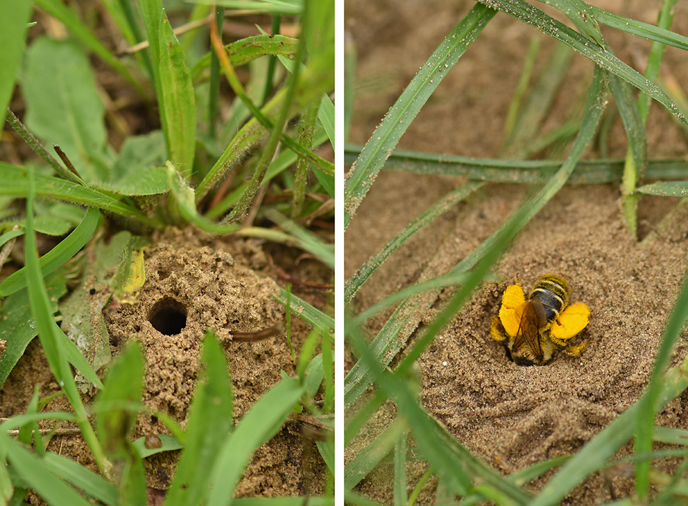 Links: Versteckt zwischen Grashalmen liegt das Nest eines Hosenbienen-Weibchens. Rechts: Beladen mit goldgelbem Pollen schlüpft ein Hosenbienen-Weibchen in ihr Nest.