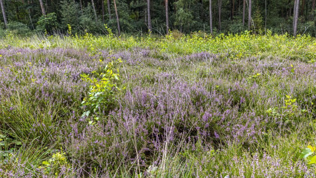 Heidefläche zur Blütezeit. Faulbäume oder Kiefern sin nur sehr wenige. Dafür gibt es noch viel zu viel Pfeifengras.