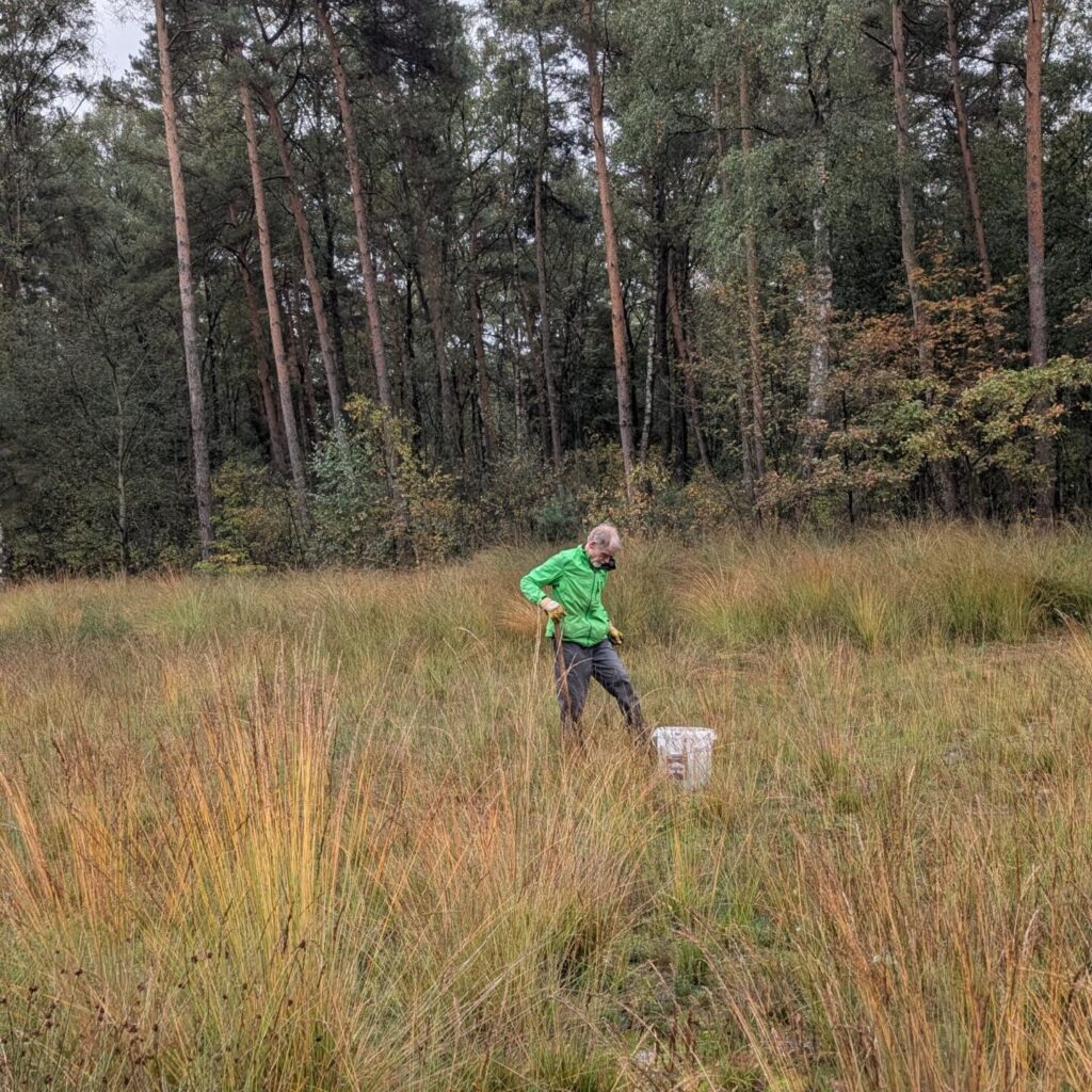 Winfried in Aktion. Heute waren wir zu dritt auf der Fläche und haben Kiefernschößlinge gezogen. Überrascht waren wir von den vielen jungen Heidepflänzchen zwischen all den Binsen. Neben junger Besenheide war auch sehr viel Glockenheide zu sehen. Teils noch mit Blüten.