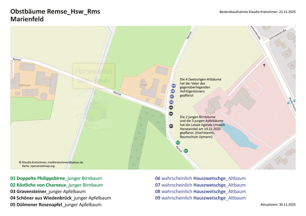 9 öffentliche Obstbäume in der RemseGPS-Koordinaten zu Baum 01: 51°58’26.4″N 8°16’38.0″E