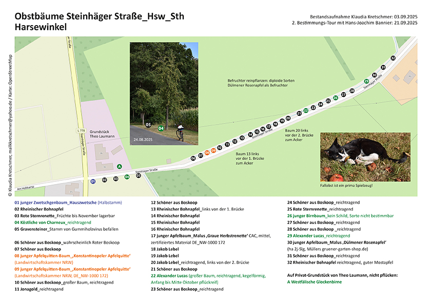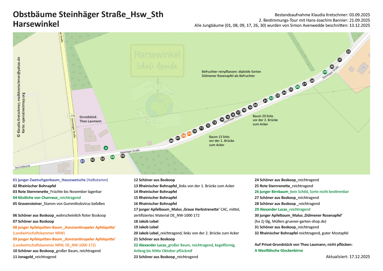 32 öffentliche Obstbäume an der Steinhäger StraßeGPS-Koordinaten zu Baum 01: 51°59’10.7″N 8°16’21.9″E