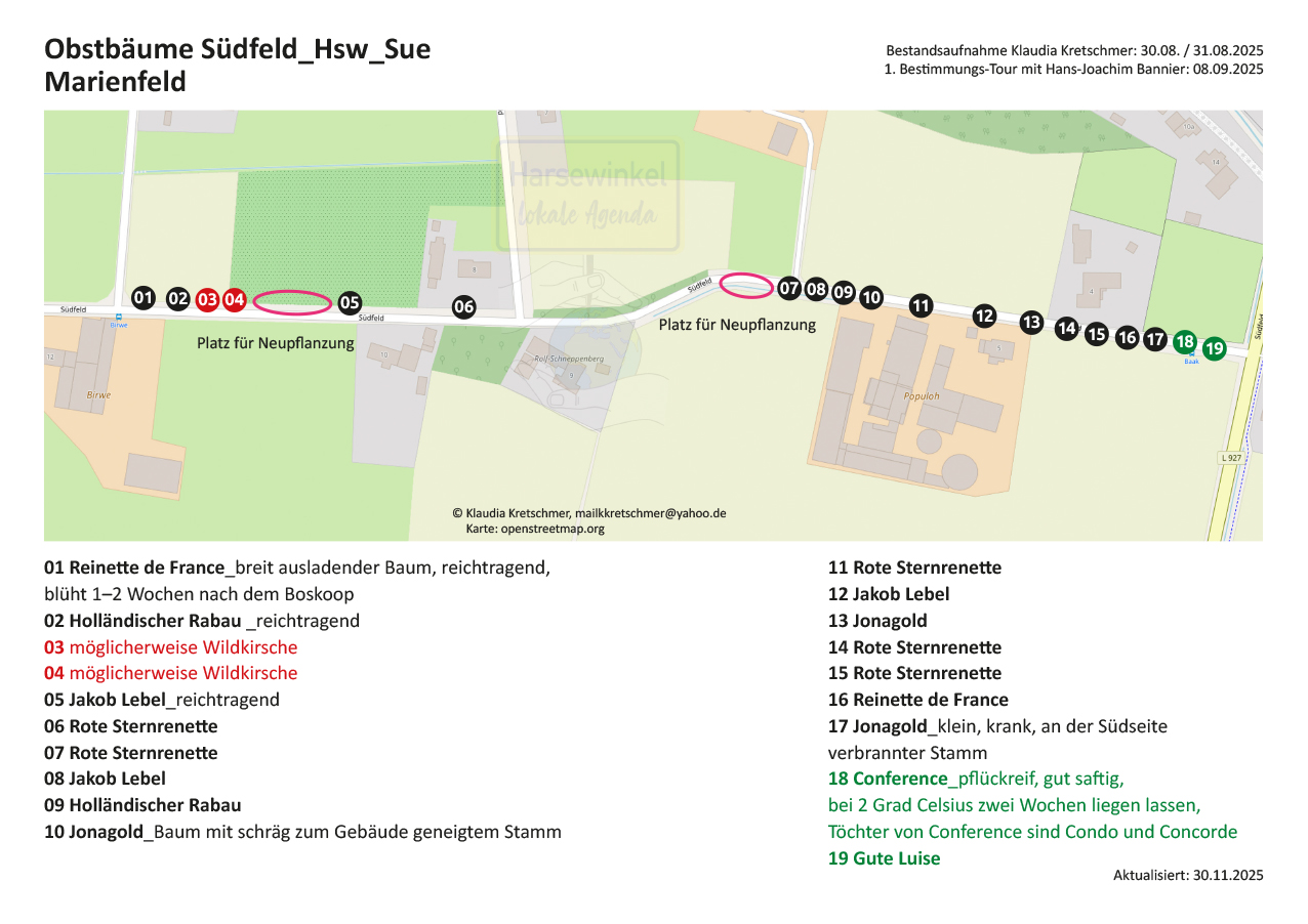 19 öffentliche Obstbäume am Südfeld (von Birwe bis Petermann)GPS-Koordinaten Südfeld: 51°56’20.0″N 8°17’27.0″E