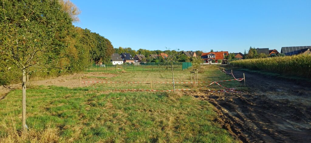 Das Regenrückhaltebecken ist gebaut und eingezäunt. Die verbliebene Freifläche wurde der Umweltgruppe der Lokalen Agenda Harsewinkel, zur naturnahen Aufwertung, von der Stadt Harsewinkel zur Verfügung gestellt.
