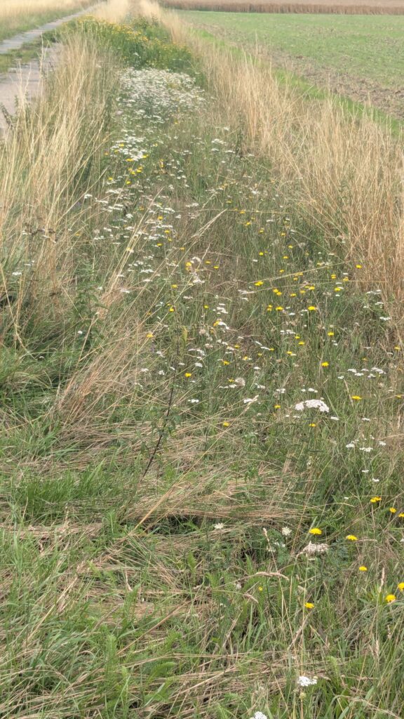 Pagenkamp: auf dem vorher gehenden Bild sieht man den gleichen Saum, wenige Wochen nach der Einsaat. Dieses Bild zeigt den aktuellen Zusand im Juli 2025. Im Mai prädsentierte sich dieser Saum in einem Meer von Blau und Rot (Klatschmohn und Kornblume). Jetzt dominieren braune, reife Gräser durchsetzt mit allerlei Blühpflanzen wie z.B. Schafgarbe, Johanniskraut aber auch noch einige Kornblumen und etwas Klatschmohn.